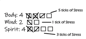 Each of the three Attributes (Body, Mind, and Spirit) has a Stress Track associated with it. The Stress Track has a number of checkboxes equal to that Attribute’s value.