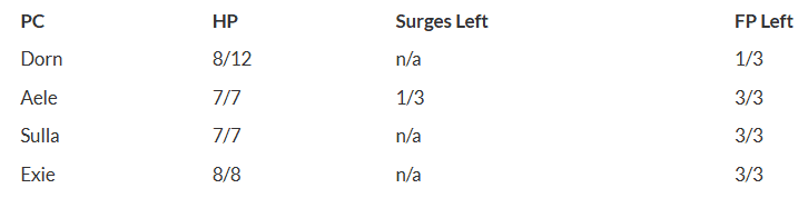 Rnd 3: Dorn lashes out with fading strength, shrewdly targeting the skeleton north of Aele, destroying it. Exie targets the skeleton southwest of her position: a hit and she destroys it. Sulla steps north and helps Dorn down a healing potion. Dorn’s eyes widen as his wounds close. And Aele uses his second Surge of the day to heal himself.