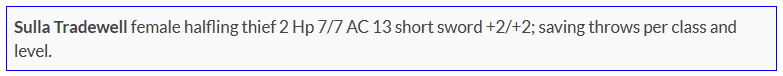 “Truce!” the halfling cries. “I mean you no harm. I am Sulla. Sulla Tradewell. Rosk sent me to offer my services as a guide. I know the dangers on this level pretty well, and I would welcome the chance to stretch my legs.”
